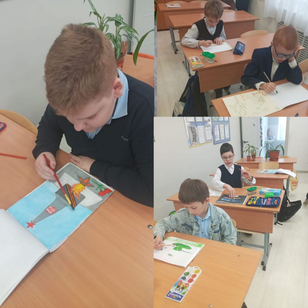 в творческих работах гуашью, карандашом и акварелью выражают свои знания и способности к эмоциональному переживанию событий, связанных с Великой Отечественной войной, готовят свои рисунки к празднику. -