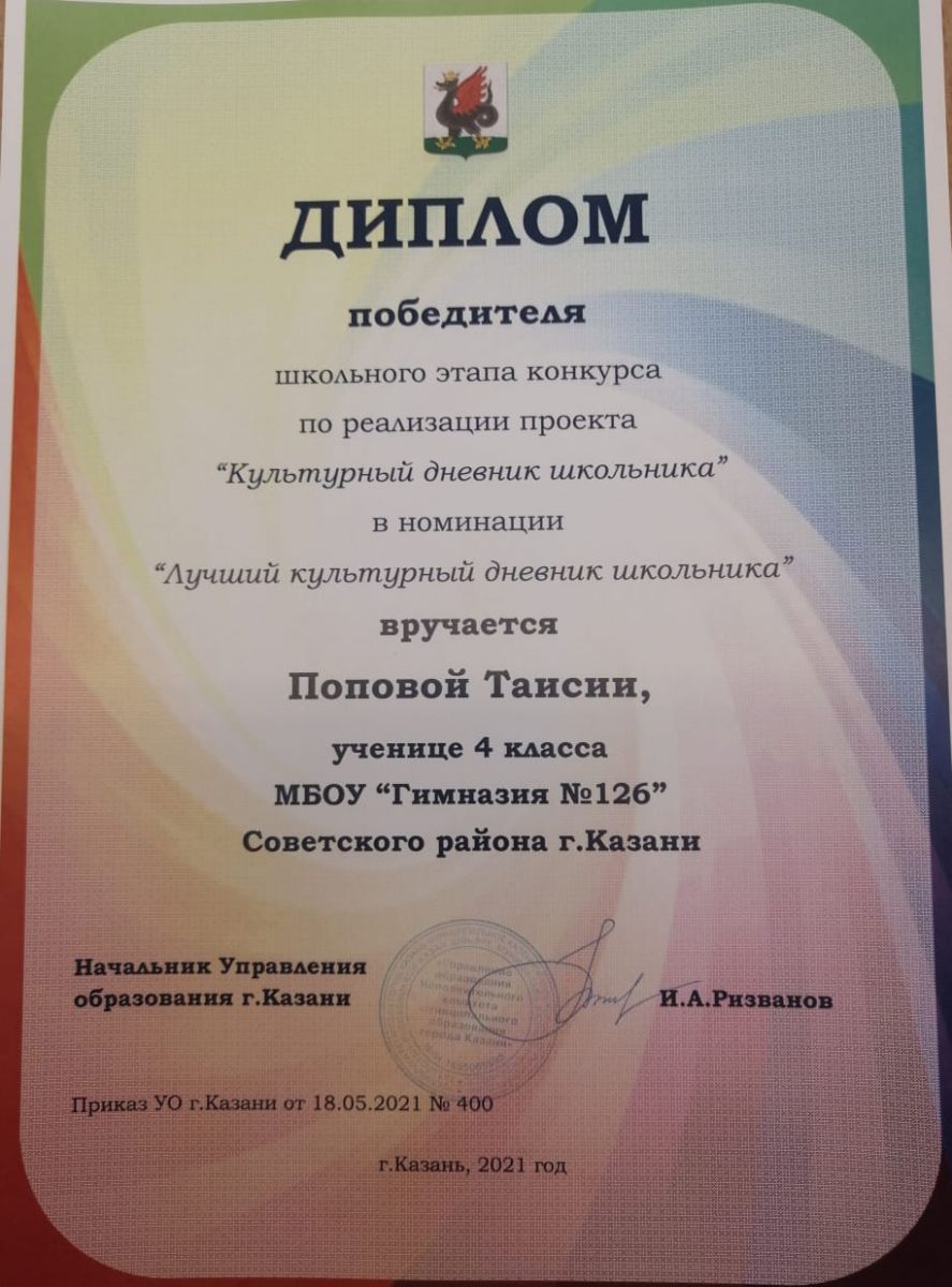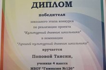 Диплом победителя школьного этапа конкурса по реализации проекта "Культурный дневник школьника" 09.06.2021