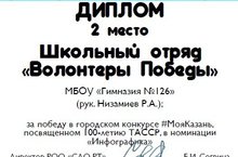 Школьный отряд "Волонтеры Победы" МБОУ "Гимназия №126" (рук. Низамиев Р.А.) награжден Дипломом 2 степени -