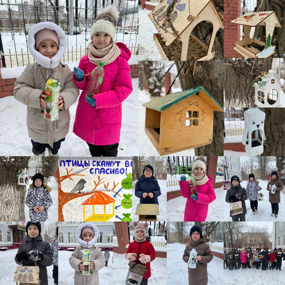 Дети своими руками из подручного материала смастерили кормушки и развесили в школьном дворе, принесли семечки,