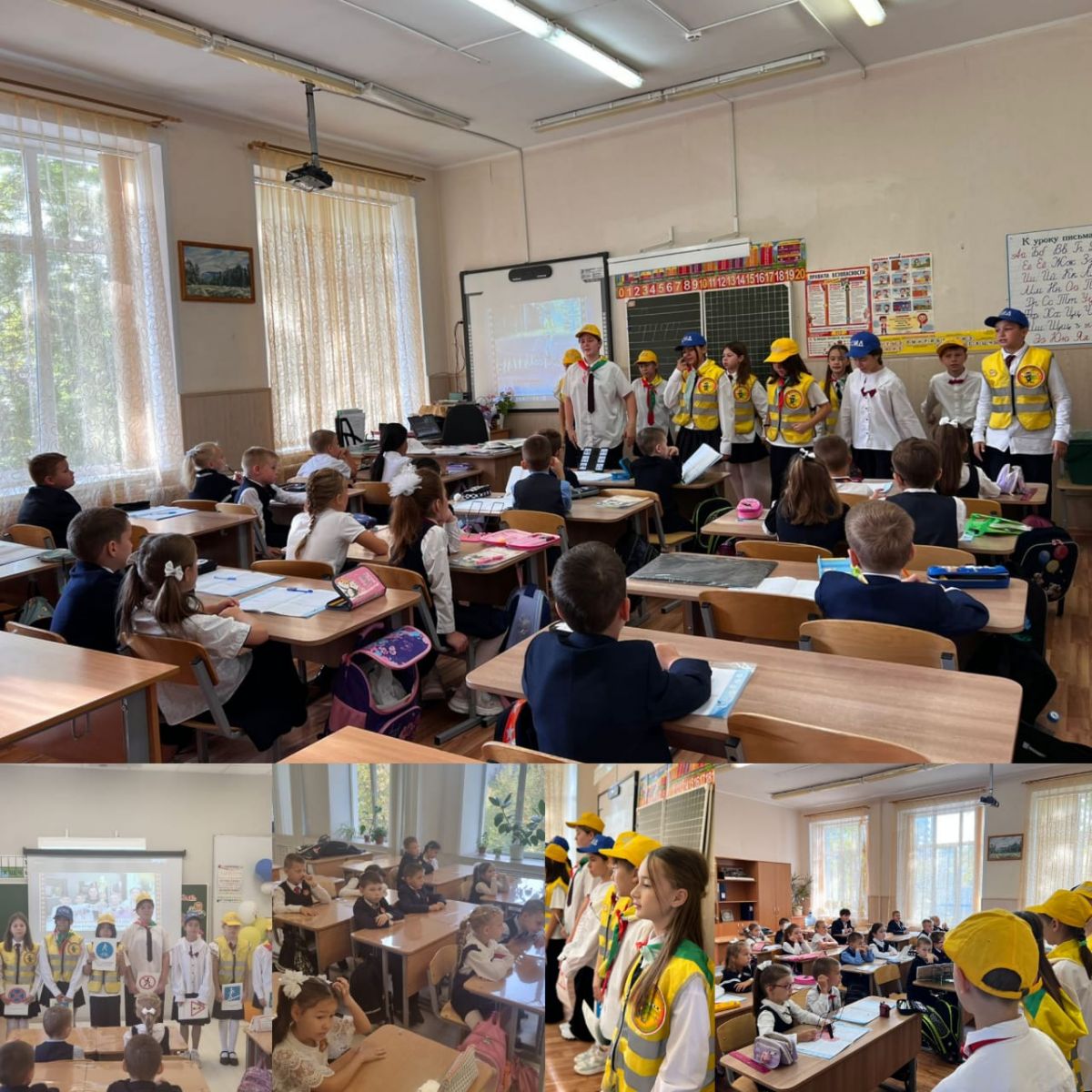 в гости к первоклассникам пришёл школьный отряд ЮИД 5Б класса.Юные инструкторы познакомили ребят с правилами безопасного дорожного движения на улице, рассказали о сложности движения на перекрёстках, а также о правилах перехода через пешеходный переход.