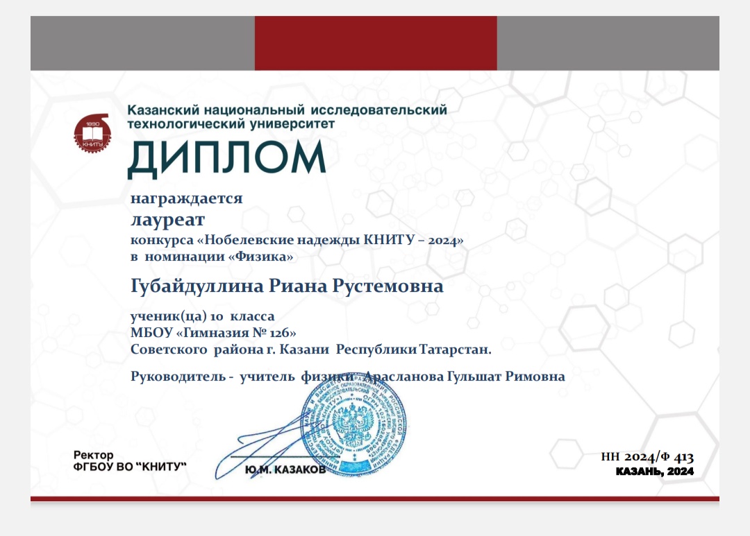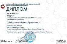 Поздравляем ученицу 10А класса Губайдуллину Риану. Диплом Лауреата конкурса "Нобелевские надежды КНИТУ - 24" в номинации "Физика". Благодарим за подготовку учителя физики Арасланову Гульшат Римовну. Желаем дальнейших успехов и побед.