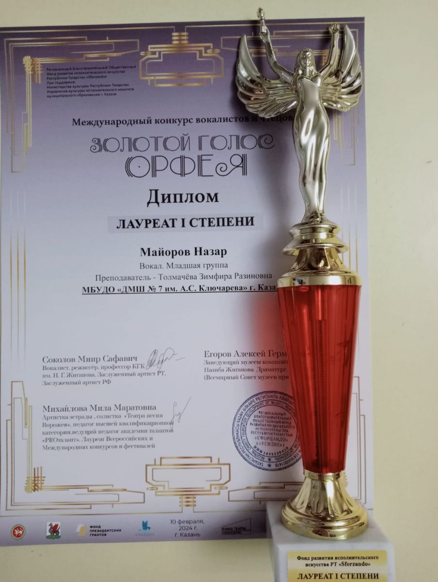 Поздравляем ученика 4 Б класса, Майорова Назара с победой! Назар принял участие Международном конкурсе вокалистов и чтецов "Золотой голос Орфея". Он исполнил песню Эдуарда Артемьева "Девочка и дельфин ". Компетентное жюри высоко оценило выступление юного вокалиста и присудило ему почетное звание Лауреата l степени. Благодарим за подготовку педагога ДМШ №7, Толмачёву Зимфиру Разиновну. Желаем новых творческих успехов и побед!