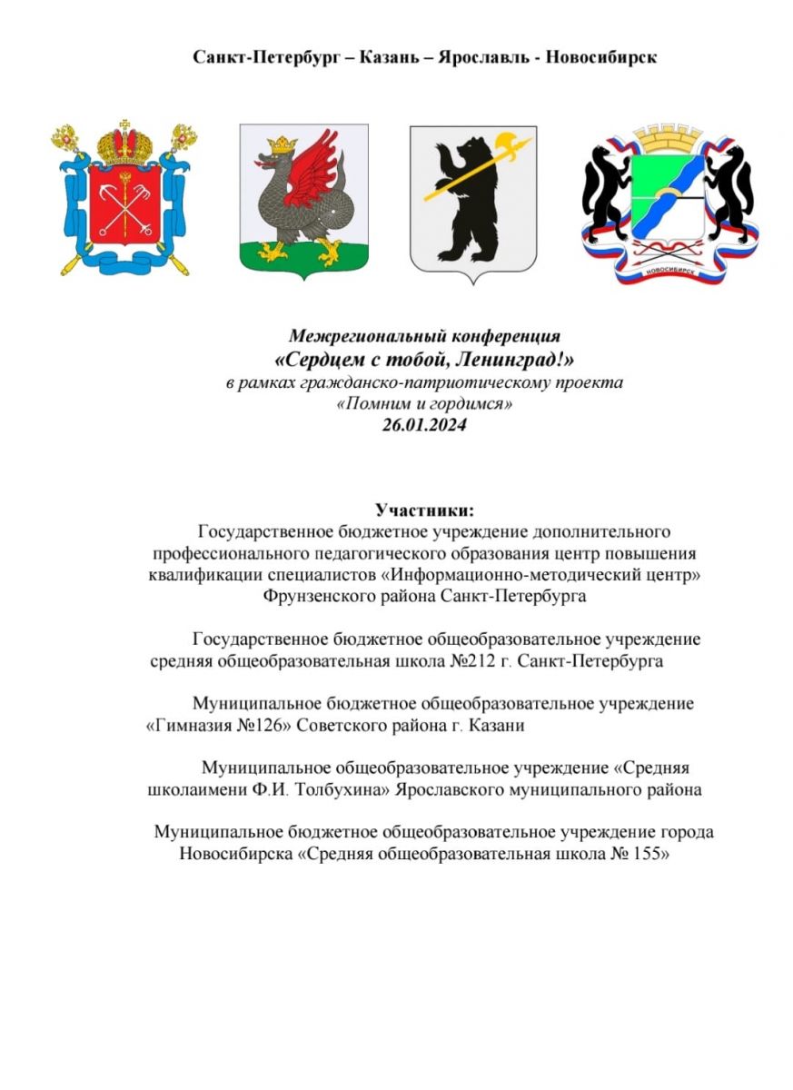 26 января наша гимназия приняла участие в Межрегиональной конференции "Сердцем с тобой, Ленинград!" в рамках гражданско-патриотического проекта "Помним и гордимся". В конференции приняли участие обучающиеся 10А класса, Гарифуллина Эндже, Захаров Егор. Благодарим за организацию и подготовку учителя истории и обществознания, Абдуллину Алину Гаяновну, заведующую библиотекой Выгловскую Нину Анатольевну, учителя музыки Куликову Миньону Борисовну. Желаем дальнейших творческих успехов.