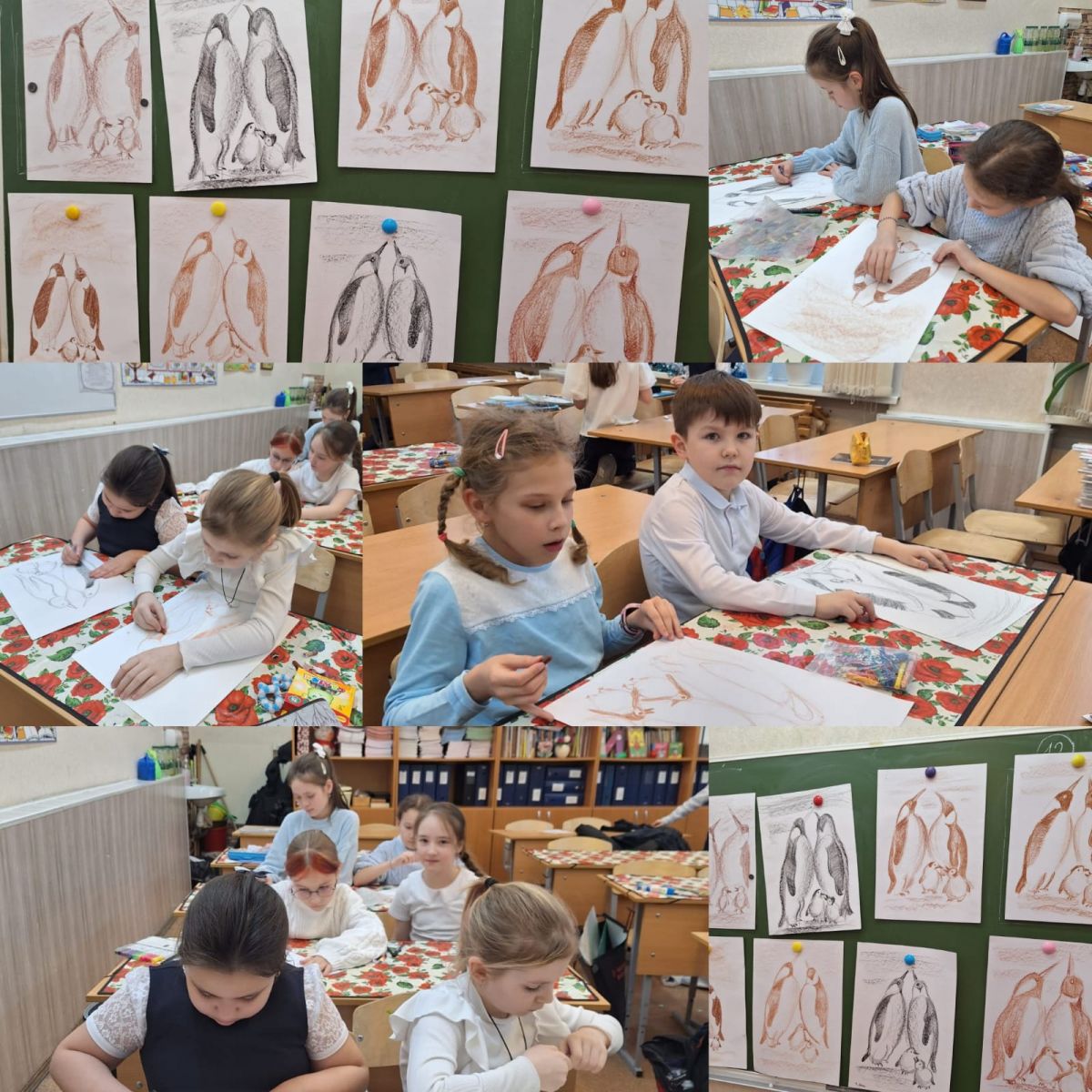 Пингвины относятся к семейству нелетающих морских птиц, представители которого хорошо плавают и ныряют. Эти животные — единственные современные в отряде пингвинообразных. На занятиях аrt-студии учащиеся 3 А класса учились рисовать мелками пингвинов.