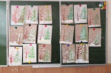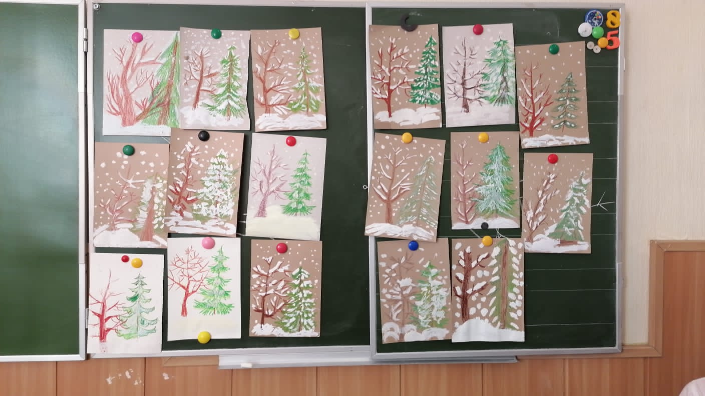 А учащиеся 1 х классов отправились на занятиях агt - студии за вдохновением в зимний лес. Работы выполняли гуашью и восковыми мелками.