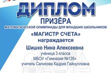 Поздравляем ученицу 3А класса, Шишко Нину с победой! Диплом Призера в математической олимпиаде для младших школьников. Благодарим за подготовку учителя начальных классов Салихову Кадрию Гайнулловну. Желаем дальнейших успехов и новых побед.