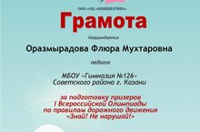 Поздравляем классного руководителя 4 Б класса Оразмырадову Флюру Мухтаровну и благодарим за подготовку призёров I Всероссийской Олимпиады по правилам дорожного движения "ЗНАЙ! НЕ НАРУШАЙ!". Желаем дальнейших успехов и неисчерпаемой энергии в работе с детьми.