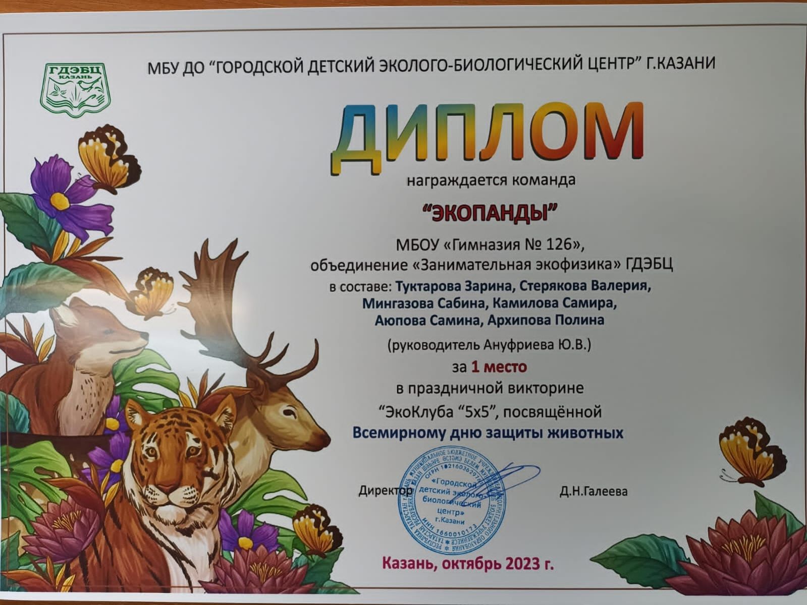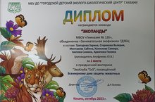 Поздравляем наших победителей-команду 4Б класса "Экопанды" и с победой: Туктарову Зарину, Стерякову Валерию, Мингазову Сабину, Аюпову Самину, Камалову Самиру, Архипову Полину. Диплом I место в праздничной викторине "Экоклуба 5х5", посвящённой Всемирному дню защиты животных. Благодарим за подготовку руководителя Ануфриеву Юлию Владимировну и желам дальнейших побед.