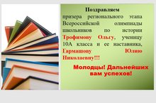Поздравляем призёра регионального этапа Всероссийской олимпиады школьников по истории Трофимову Ольгу, ученицу 10А класса и её наставника, Гармашову Юлию Николаевну! Молодцы! Дальнейших вам успехов!