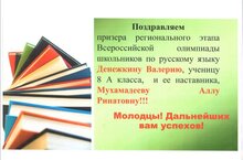 Поздравляем призера регионального этапа Всероссийской олимпиады школьников по русскому русскому языку Денежкину Валерию, ученицу 8А класса, и её наставника Мухамадееву Аллу Ренатовну!