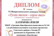 С декабря по февраль проводился VI Межрегиональный конкурс чтецов "Туган телем- серле тел". Из нашей школы педагоги родного языка и литературы готовили учащихся 4-5 классов. По итогом заключительного этапа ученик 4в класса Галиев Искандер (рук.Залялиева Л.Р.) был удостоен диплома 3 степени. Ученицы 5 в класса Шайхина Рания ( рук Макарова И.А.) удостоена диплома 3 степени, а Хатимова Язиля (рук.Курманова А.Ш) диплома 2 степени. Поздравляем учащихся и их руководителей с успешным выступлением. Молодцы!