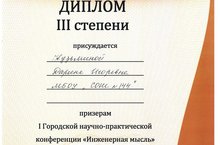 Поздравляем Кузьмину Дарину, ученицу 8 класса, которая стала призером I городской научно-практической конференции "Инженерная мысль"