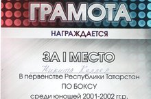 Поздравляем Келлера Никиту - ученика 9б класса нашей школы -победителя в первенстве Республики Татарстан по боксу среди юношей 2001-2002 года рождения, в весовой категории 66 кг.. Соревнования проходили с 25 по 28 января 2017 года в городе Казань. Молодец! Дальнейших успехов!