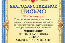 С декабря 2015 года по февраль 2016 года в Казани проходил Конкурс «Литературный Татарстан»: эрудиты - к барьеру!, где нужно было ответить на 75 вопросов про литераторов, писателей и поэтов РТ. Учителя татарского языка и литературы - Гаязова А.И. и Миннуллина Л.Р. приняли активное участие в в этом конкурсе. Торжественное вручение благодарственных писем и дипломов состоялось в марте в ДЦТ им.А.Алиша. И наши учителя были удостоены благодарственного письма. Поздравляем!