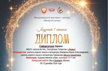 Поздравляем ученицу 5в класса Сафаргулову Зарину с дипломом Лауреата 1 степени на Международном фестивале-конкурсе "Звездный дождь" в номинации "Художественное слово".