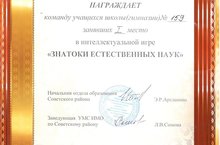 Поздравляем команду учащихся Лицея № 159, занявших I место в районном этапе интеллектуальной игры "ЗНАТОКИ ЕСТЕСТВЕННЫХ НАУК"!
