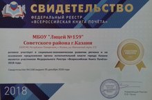 По итогам 2018 года Лицей №159 включен в Федеральный Реестр "Всероссийская Книга Почёта" 2018 года. В Реестр включаются лучшие организации, предприятия, учреждения Российской Федерации.