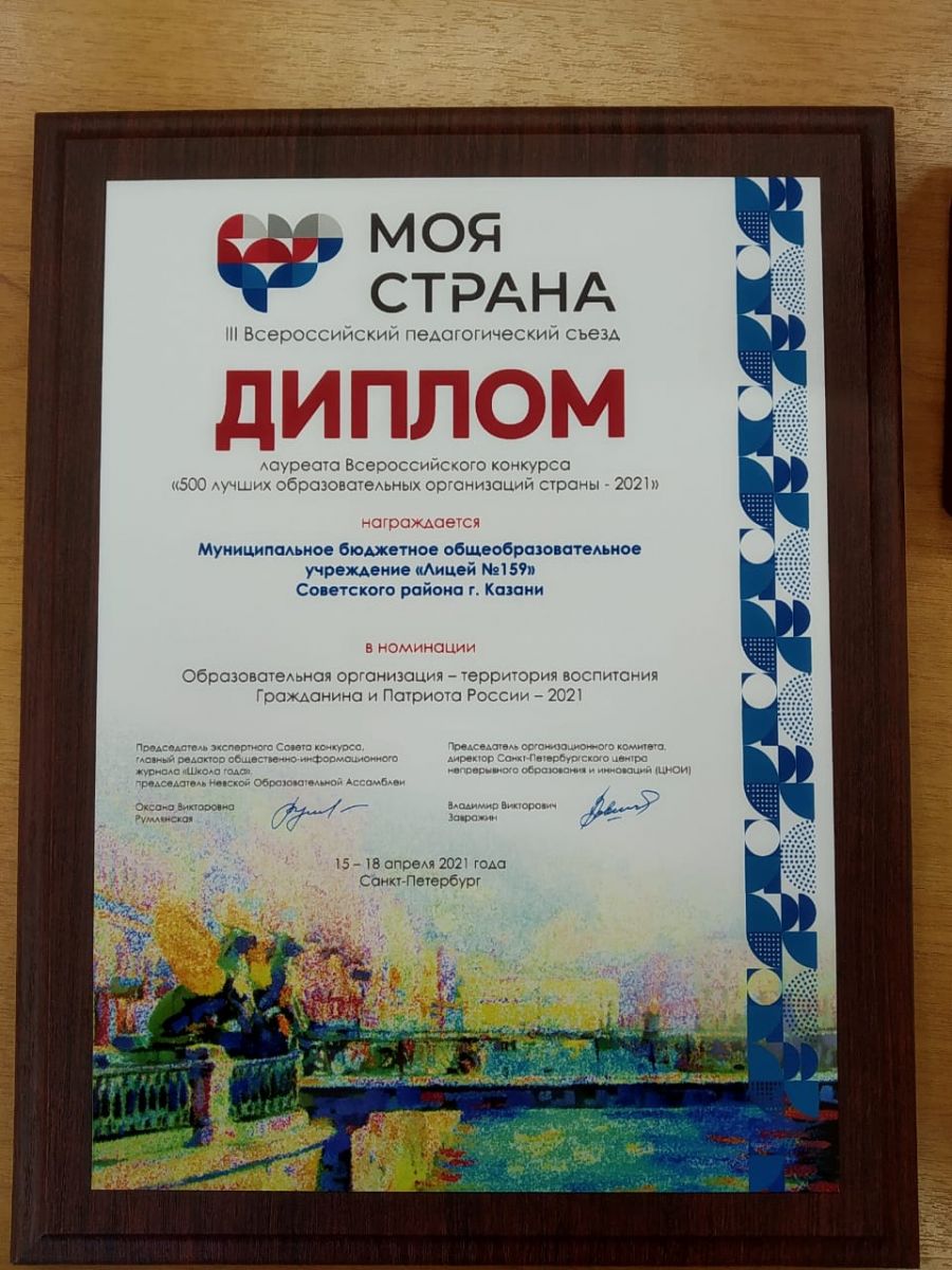 Опубликовано: 27.04.2021Лицей 159 - Лауреат Всероссийского конкурса "500 лучших образовательных организаций страны - 2021" в номинации "Образовательная организация - территория воспитания Гражданина и Патриота России - 2021"