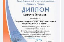 В очередной раз вокальный ансамбль "Веселые нотки" в составе учащихся 4Б класса принял участие в республиканском конкурсе-фестивале "Патриоты России!". Ребята, неоднократно демонстрировавшие свой талант членам жюри, смогли покорить их и в этот раз. По итогам выступления ансамблю удалось завоевать звание лауреата I степени. Поздравляем ребят, а также Красильникову Е. Е. и Шаганову О. А. - руководителей детского коллектива!