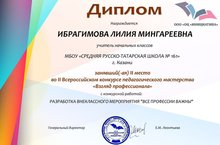 Педагог нашей школы Ибрагимова Лилия Мингареевна приняла участие во II Всероссийском конкурсе педагогического мастерства "Взгляд профессионала". Лилия Мингареевна представила на конкурсе работу "Разработка внеклассного мероприятия "Все профессии важны". По итогам конкурса учителю начальных классов удалось занять II место. Поздравляем и желаем дальнейших профессиональных успехов!