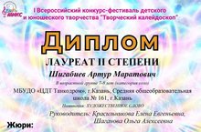 Состоялся I Всероссийский конкурс-фестиваль детского и юношеского творчества "Творческий калейдоскоп". На нем в возрастной группе 7-8 лет (соло) принимал участие ученик нашей школы Шигабиев Артур. Пройдя конкурсные испытания, представив свое произведение опытным членам жюри, Артуру удалось стать лауреатом II степени в номинации "Художественное слово". Поздравляем Артура и его руководителей Красильникову Е. Е. и Шаганову О. А. и желаем успеха и побед!
