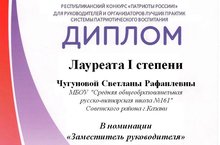 Стали известны итоги Республиканского конкурса "Патриоты России" для руководителей и организаторов лучших практик системы патриотического воспитания. На нем систему работы школы в данном направлении представляла заместитель директора по ВР Чугунова С. Р. В формате видеоэссе она рассказала о структуре и о программе патриотического воспитания молодежи, а также о планах на будущее. По итогу ей удалось завоевать диплом лауреата I степени в номинации "Заместитель руководителя". Поздравляем Светлану Рафаилевна и желаем успехов и профессионального роста!