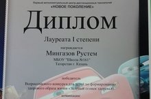 Поздравляем Мингазова Рустема, ученика 4 А класса, получившего Диплом лауреата 1 степени Всероссийского конкурса для детей по формированию здорового образа жизни "Зеленый огонек здоровья" в номинации "Рисунок". Руководитель: Батыршина М.Р.