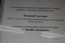 Администрация Советского района г.Казани выражает искреннюю признательность ученице 8Б класса МБОУ "Школа № 161" Юдиной Светлане за помощь в организации и проведении акции "Спасибо, ветераны".