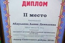 Поздравляем Абдуллину Алину, ученицу 7А класса, занявшую 2 место в районном конкурсе "Лидер года" среди активистов детских общественных движений возраста 11-13 лет. Педагог: Чугунова С.Р.