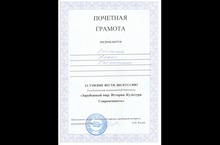 Почетной грамотой Института Международных Отношений награждается Фарманов Динислам Шухратович за лучшее эссе Республиканской межпредметной Олимпиады «Зарубежный мир: История. Культура. Современность».