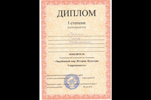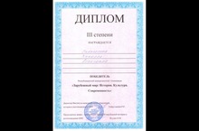 Награждается Галиуллина Камилла, Победитель Республиканской межпредметной Олимпиады награждается «Зарубежный мир:История. Культурв. Современность». (Диплом III cтепени Института Международных Отношений).