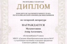 9В сыйныфы укучысы Мөхәммәтҗанов Әмирне татар әдәбиятыннан Республика олимпиадасында җиңүе белән котлыйбыз!!!!Аңа киләчәктә дә уңышлар телибез!!! Укытучысы Зөлфия Хатыйповнага, Әмирнең әти-әнисенә олы рәхмәтебезне белдерәбез!!!! Поздравляем ученика 9В класса Мухаметзянова Амира с победой на заключительном этапе олимпиады по татарской литературе. Желаем дальнейших успехов!!! Выражаем благодарность учителю татарского языка и литературы Зульфие Хатиповне и родителям Амира Лилие Хатыповне и Асхату Хатиповичу.