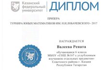 ВАЛЕЕВА РЕНАТА стала ПРИЗЁРОМ ТУРНИРА ЮНЫХ МАТЕМАТИКОВ им. Н.И.ЛОБАЧЕВСКОГО - 2017. 27.04.2017