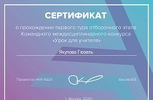 Учитель обществознания Якупова Г.А. успешно прошла 1 тур отборочного этапа командного междисциплинарного конкурса "Урок для учителя", направление: "Обществознание". Организатором конкурса является Национальный исследовательский университет «Высшая школа экономики». Что дает конкурс учителю? Возможность пройти курсы повышения квалификации, экспертную поддержку и опыт командного взаимодействия, возможность донести свои идеи до профессионалов и обменяться опытом, площадку для расширения круга профессиональных контактов и многое другое! Искренне желаем Гюзель Альбертовне удачи на всех этапах конкурса!