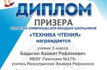 Поздравляем призера городской олимпиады "Техника чтения" ученика 3г класса Бадыгина Азамата. Желаем Азамату покорить новые вершины страны Знаний!
