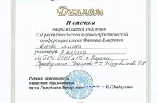 21 нче март көнне Казан шәһәренең Яңа Савин районында урнашкан 170 нче мәктәптә Фатих Әмирхан исемендәге VIII нче республика күләмендә үткәрелгән фәнни- гамәли конференциясе булып үтте. Бу конференциядә мәктәбебезнең7а сыйныфы укучысы Алеева Алина (җитәкчеләре:Гафарова Г.Г., Габделвәлиева Р. Н.) да катнашты.Ул II дәрәҗә диплом белән бүләкләнде. Алинага алга таба да уңышлар телибез!