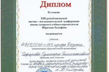10нчы февраль көнне Казан шәһәре Авиотөзепеш районының 14 нче гимназиясендә татар мәгърифәтчесе галим Ибраһим Халфин истәлегенә багышланган республика фәнни-гамәли конференциясе үткәрелде. Бу конференциядә 10 нчы “А” сыйныфы укучысы Исхакова Зилә (укытучысы Әхтәмова Г.М.), 11 нче “А” сыйныфы укучылары Шайдуллина Земфира, Якимова Анна (укытучысы Самигуллина М.Г.) төрле юнәлешләрдә уңышлы чыгыш ясап, сертификат белән бүләкләнделәр. Шулай ук мәктәбебезнең туган тел һәм әдәбияты укытучысы Гафарова Гөлнара Галимхан кызы конференциядә укытучылар өчен үткәрелгән номинациядә катнашып II дәрәҗәдәге дипломга һәм истәлекле бүләккә лаек булды. Конференциядә катнашкан укучыларга һәм укытучыларга алга таба да уңышлар телибез!