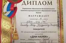 Поздравляем учащихся нашей школы, принявших участие в научно-практической конференции школьников "Дни науки" на базе школы №131, Шайдуллину Земфиру и Якимову Анну (10А класс) - с первым местом, а также Низамова Инсафа - с призовым местом. Желаем дальнейших успехов!