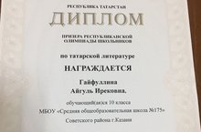 10 нчы сыйныф укучысы Гайфуллина Айгөл рус телендә гомуми урта белем бирүче мәктәпнең татар төркемнәрендә белем алучы укучыларның татар әдәбиятыннан республика олимпиадасының призеры булды. Әфарин, Айгөл. Алга таба да уңышлар телибез.