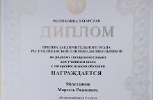 Гимназиябезнең 8а сыйныфы укучысы Мөхетдинов Марсель татар мәктәпләрендә укучылар өчен татар теленнән республика олимпиадасында призёр булды. Афәрин, Марсель! Искренне поздравляем Мухитдинова Марселя, ученика 8а класса, ставшего призером Республиканской олимпиады школьников по татарскому языку! Молодец, Марсель! Благодарим учителя Хакимову М.С. за подготовку обучающегося к олимпиаде!