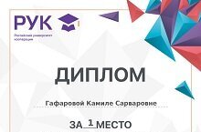 Поздравляем Гафарову Камилю, ученицу 5а класса, Казакову Арину, ученицу 10а класса, занявших 1 место в олимпиаде по татарсокму языку, проводимой Российским университетом кооперации. Желаем нашим ученицам новых достижений в олимпиадном движении. Благодарим учителя татарского языка и литературы Гафарову Г.Г.