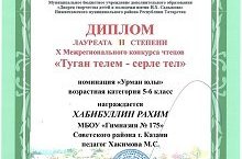 Поздравляем Хабибуллина Рахима, ученика 5г класса, ставшего лауреатом II степени Межрегионального конкурса "Туган телем- серле тел" в номинации "Урман юлы" (учитель Хакимова М.С.). Молодец, Рахим! Желаем новых творческих побед!