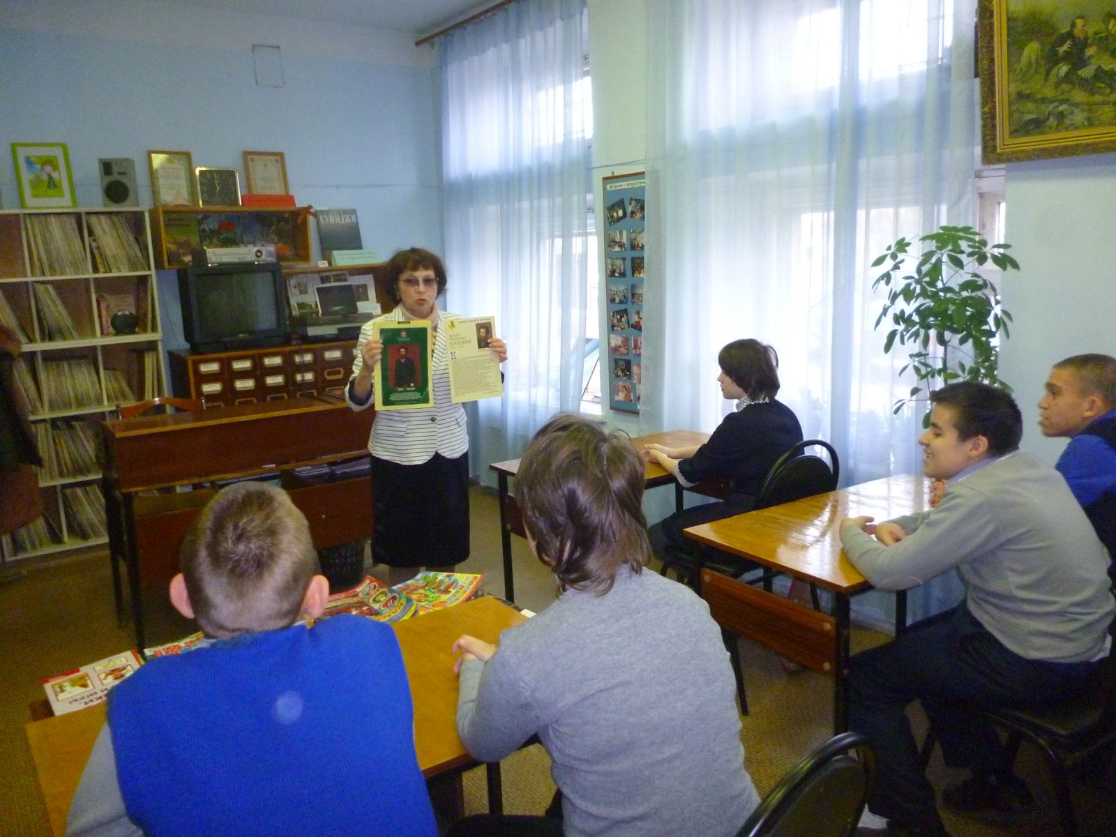 Опубликовано: 26.10.201626.10.16г. в очередной раз ребята нашей школы вместе с педагогом-библиотекарем Федотовой Г. С. посетили сектор искусств ЦДБ МБУК «ЦБС г. Казани», где главный библиотекарь Пекина Л. П. провела увлекательную беседу на тему: «Магия таинственного света», приуроченная к 175-летию мастера пейзажной живописи А. И. Куинджи. Учащиеся 6б, 8б классов познакомились с биографией художника, его творчеством, просмотрели выставку его картин. Больше всего ребятам понравились картины, где художник показывает красоту русской природы.Фото1 .