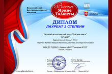 Сразу два диплома лауреатов заслужили коллективы Экологического театра на Всероссийском фестивале-конкурсе искусств «России яркие таланты», прошедшем в Симферополе. И если успех спектаклей «Теремок» с «Осенняя история» уже не первый, то «Красную книгу» с «Огнивом» по пьесе Р.З.Гатауллина и её руководителя Ф.Ф.Валиеву особо хочется поздравить с высоким достижением! Известная на протяжении двух веков сказка Андерсена заиграла «экологическими» красками, сдружив в финале Солдата, проходившего мимо «современного Кота» и даже… Пса из дупла! Разыгранная в этот раз история закончилась хэппи-эндом…