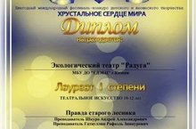 Поздравляем ребят объединения «Экологический театр «Радуга» с диплом Лауреата I степени международного фестиваля «Хрустальное сердце мира» за исполнение пьесы «Правда старого лесника» по мотивам рассказа М.М. Пришвина «Кладовая Солнца»