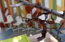 В живом уголке нашего центра новый экзотический питомец - австралийский палочник, или палочник Маклея. Это крупное тропическое насекомое из отряда Привиденьевые (Phasmatidae). В природе эти насекомые обитают в Австралии, но в настоящее время вид стал популярен в террариумистике, у любителей насекомых. Тело и ноги палочко-листовидной формы, покрыто колючими шипами. Тем самым они прекрасно маскируются среди веток и листвы кустарников и деревьев. Кроме того, стараясь постоять за себя, поднимают заднюю часть брюшка и внешне становятся похожими на скорпиона. Могут издавать неприятный запах, отпугивающий хищников. Для человека они безопасны. Самцы имеют крылья и способны к полету. У самок крылья не развиты. Растительноядны - питаются листьями эвкалипта, ежевики, малины, шиповника, дуба, бука.