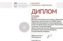 В апреле 2020 г. кафедра начального образования Института психологии и образования КФУ провела Международный конкурс видеофильмов спектаклей младших школьников «Золотая маска».К сожалению, возрастные ограничения не позволили принять участие в конкурсе сборной команде театра «Радуга». Но Медвежонок в исполнении Таисии Мауль с группой «Звёздочки», удачно представленный на осеннем «Празднике Урожая», оказался достойно оцененным. Лауреатов в «Золотой маске» не предусмотрено, так что это - заслуженное второе место в «списке победителей».