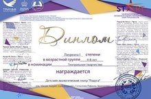 Дипломом лауреата I степени Международного конкурса «START. Путь искусств» творческого объединения «Триумф» с приглашением в Москву награждена команда Таисии Мауль и младших актёров экологического театра «Радуга»! Маленький Медвежонок, подобно Стрекозе из басни Крылова, не хотел всё лето трудиться, а полез воровать урожай в пчелиное гнездо... «Такой «урожай» собрал, что живого места на теле не осталось! Зимой опять придётся, видно, только лапу сосать...» - пишет автор и режиссёр-постановщик Р.З.Гатауллин. Видимо, по-другому не доходит до любителей лёгкой наживы…А ведь это была очередная «дежурная» постановка для «Праздника Урожая». Могли ли наши зрители знать, что смотрят столь солидный спектакль?