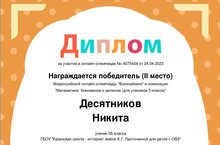 Учащиеся 5Б класса приняли участие во Всероссийской онлайн-олимпиаде "Всезнайкино" в номинации "Математика: Умножение и деление" и заняли второе призовое место. Поздравляем Десятникова Никиту и Маслову Арину.